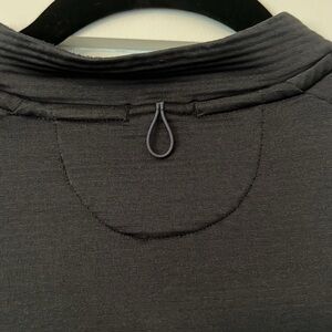 Black, hip-length mock neck pullover w/ sleeve "gloves"