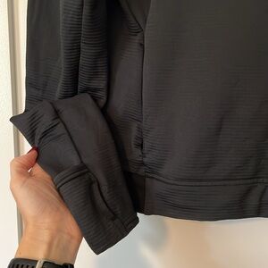 Two front pockets, thumbholes in sleeves