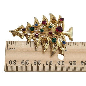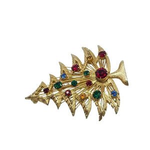 Brooks Textured Multicolor Rhinestone Christmas Tree Brooch Pin Gold Tone VTG