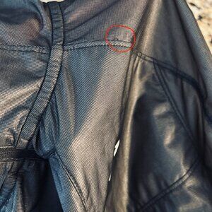 Has small pinhole, in front one inch from neckline on left seam from sales tag. (see magnified photo) Not noticeable.