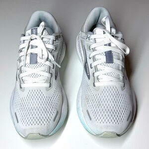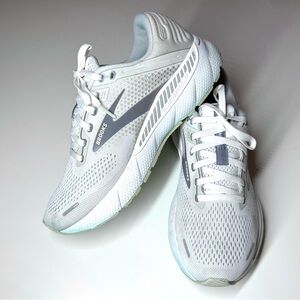Sleek and supportive Brooks athletic shoes. Ideal for running. Stylish white and gray design.