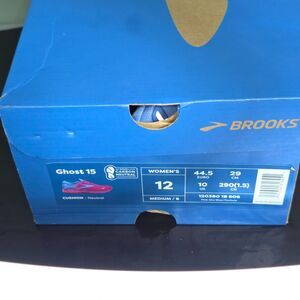 Brooks Women's Ghost 15 running shoe in the "Pink Glo/Blue/Fuchsia" Size:m12