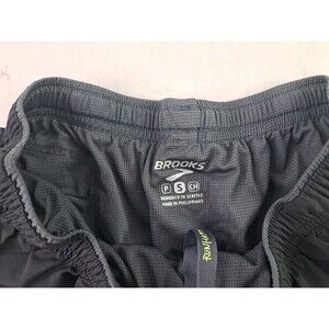 Elevate your workout wardrobe with these Brooks Women's Lined Running Shorts in size small. The black shorts feature a drawstring closure and are made from a blend of polyester, spandex, and polyester blend fabric with a solid pattern and blended fabric type. The athletic fit and waist compression area provide comfort and support during various activities, such as gym and training, crossfit, and running and jogging.