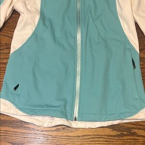 Warm and functional running jacket by Brooks. Teal and white color scheme. Ideal for any sport or everyday were. Soft fleece lining. Pretty ribbon zipper detail . Previously owned but very good condition. A little pilling along collar