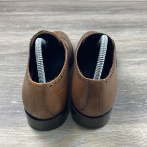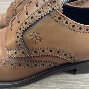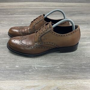 The product is a pair of Brooks Brothers 1818 Wingtip Oxford Shoes in men's size 10. These brown leather shoes are made in Italy and feature a classic solid pattern with wingtip detailing. As a dress shoe from a renowned brand like Brooks Brothers, these shoes are designed for both style and quality, making them a timeless addition to any man's wardrobe. The craftsmanship and high-quality materials used in these shoes ensure durability and a sophisticated look for formal occasions or professional settings.