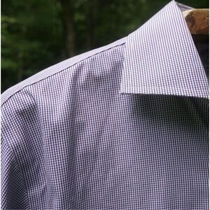 - Classic 100% cotton crisp white collared button front dress shirt with navy blue and red micro check pattern by Brooks Brothers