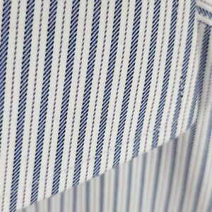 Great pre-owned condition button-down; white with blue and darker purple colored thin stripes.