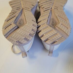 cream running shoes with a rose gold/orange emblem. good preloved condition.