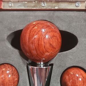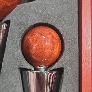Brookstone Set Of 3 Mahogany Wine Stoppers in wooden box. Stoppers are in great condition however box is in rough condition, please see pics.