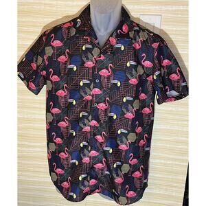 The Brother Threads Men's Addicted to Summer Black Neon Flamingo Toucan Shirt in size M features a regular fit with a short sleeve design, making it perfect for the summer season. The shirt showcases a vibrant graphic print of neon flamingos and toucans against a black woven fabric. It has a button closure and is ideal for casual wear.