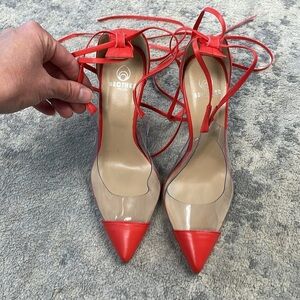Brother Vellies De Fleur Ankle Tie Pointed Toe Pumps Red Orange PVC Sz 6