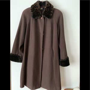 Brown 100% wool coat with faux fur print collar and cuffs, side pockets, Excellent condition, worn few times. Very elegant and fashionable.