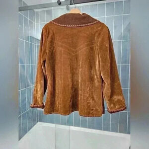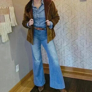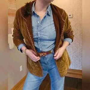 Brown 70s feel Retro Fuzzy Jacket. Has a lot of fun detailing. There are a few yellow spots which may be bleach on the sleeves but not very noticeable. Has a sheerling look, very cute! Size Medium.