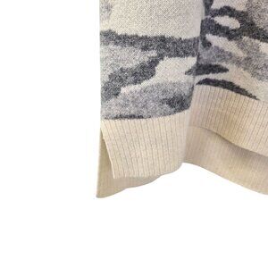 Heavier weight cashmere and wool blend cashmere sweater with a camouflage print. Split hem design with a little longer hem at the back. The colorway is grays and cream.