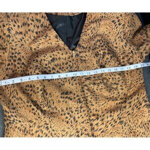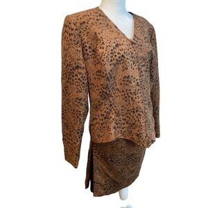 Brown Animal Print Long Sleeve Two Piece Skirt Top Set V Neck Front Zipper Sz M