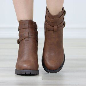Brown Ankle Boots Chunky Lug Block Heel Synthetic Leather Round Toe