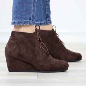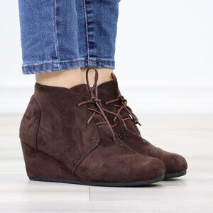 Brown Ankle Boots Wedge Heel Faux Suede Round Toe Lace Up