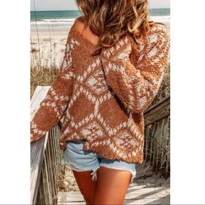 Brown oversized Aztec print knit sweater.