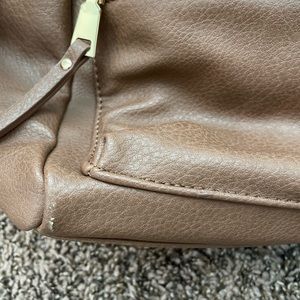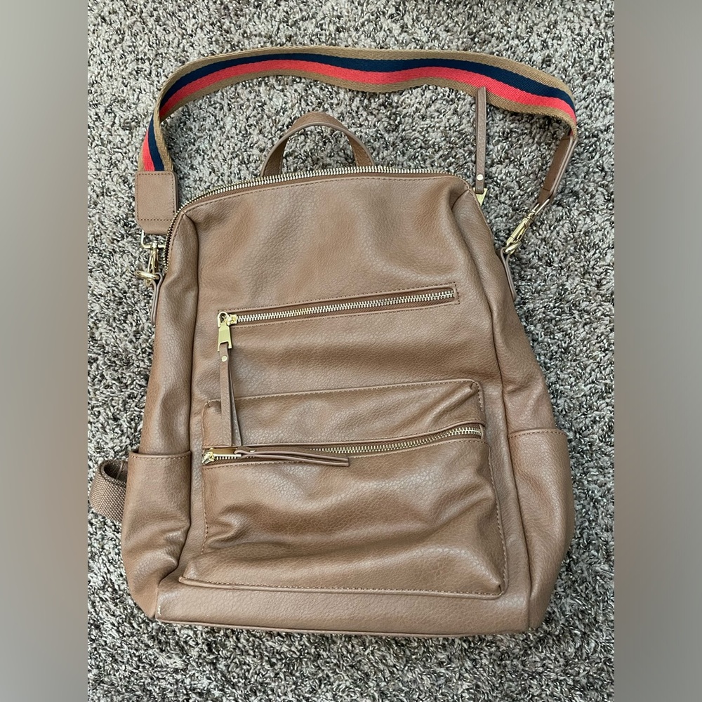 Selling a brown backpack from Amazon. Has lots of zipper compartments and two side pockets for a water bottle..will fit a slim water bottle or plastic 16.9oz bottle. Has a strap and can be used as a shoulder bag but can be removed. Backpack straps cannot be removed. Only used for a few months as a work bag but no longer need. Still in very good condition but does have a tiny scuff on the bottom.