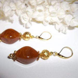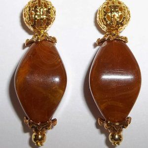 This is an eye-catching set. Brand new and handmade by me - wvluckygirl. Handcrafted with gorgeous brown acrylic beads that have lighter swirls in them. They have ornate gold toned costume jewelry beads which are antiqued in black. Big gold bead is hollow inside. The pair dangle and drop from lever backs for women's pierced ears. 2 1/2 inches long and about 1/2 inch wide. Each single earring weighs approximately 2.8 grams. You can never have enough brown jewelry! It goes with everything! This fashion accessory makes a great gift idea!