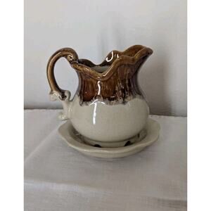 Brown Beige Glazed Pottery Small Planter Pitcher With Attached Saucer 5" x 5"