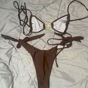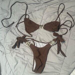 Stylish brown bikini set perfect for a day at the beach. Features a chic design with side ties for a customizable fit. Ideal for making a statement by the water.