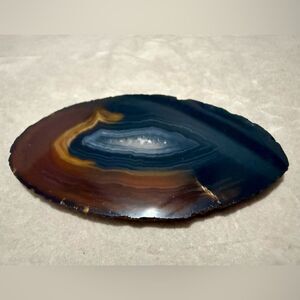 This polished agate slice features rich bands of black, brown, caramel, and smoky blue, with a sparkling crystallized center. The organic oval shape and raw edges make it perfect as a decorative stone, photography prop, or desk accent. Measures approximately 4.75” x 2.5”. One-of-a-kind and ready to display.