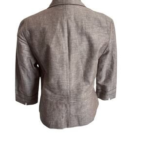 Coldwater Creek structured blazer jacket in a brown textured linen-blend fabric with tailored pleats, wide notched lapel, and 3-button front. Feminine darting with cropped 3/4 sleeves and double stitched detailing on cuffs and placket.