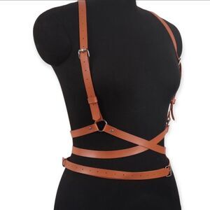 Brown harness with adjustable suspenders straps, body harness with multi waist wrap belt. Silver hardware, adjustable Body harness multi waist wrap harness belt in faux leather brown! Waist enhancing harness!