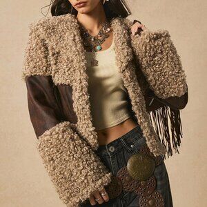 This short, casual teddy jacket features a lapel neckline and extra-long sleeves, perfect for late fall. The regular fit design ensures a comfortable wear, while the colorblock pattern and fur fringe add a bohemian touch.