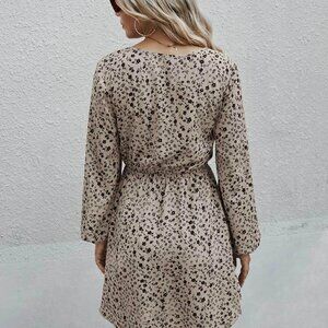 Brown Boho Womens Ditsy Floral Tie Neck Bishop Sleeve Layered Dress