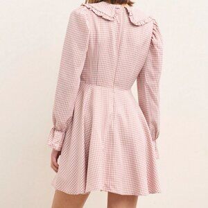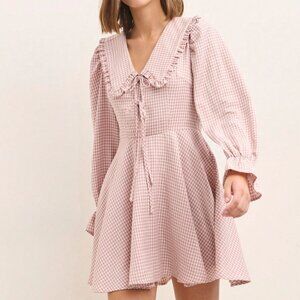 Elevate your style with this long sleeve, mini-length dress featuring a statement collar and ruffled details. Made with a plain design, it offers a cute, boho look. The brown color and A-line shape create a flattering silhouette, while the V-neck adds a touch of elegance.