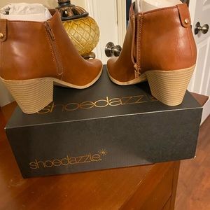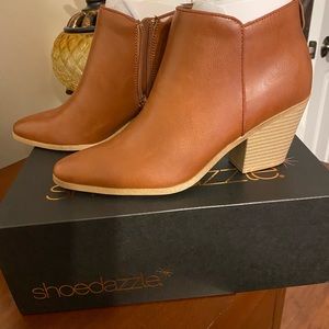 Brown leather booties. Runs a little large. Can fit a 7.5. I wear a 7.5 and these fit with room to spare.
