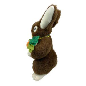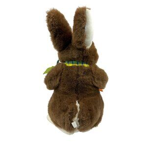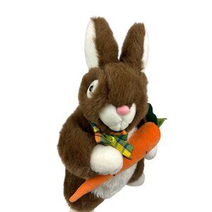 Cuddly plush brown bunny rabbit holding a carrot. Features a colorful plaid bow and soft fur, perfect for Easter!