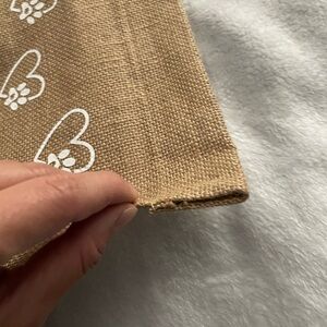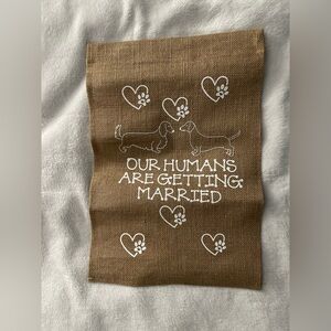 Charming brown burlap sign with white text and dog illustrations. Perfect for announcing a wedding. Handmade just will need to be flattened. Fits on a garden sign.