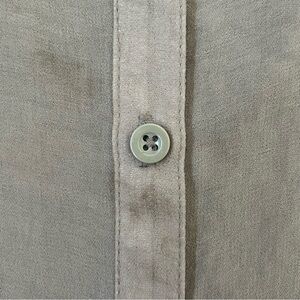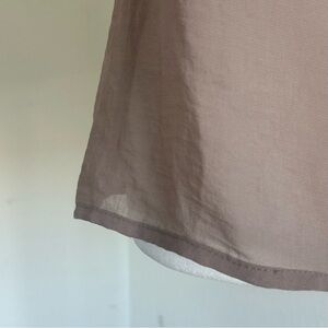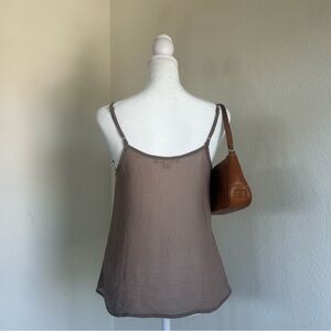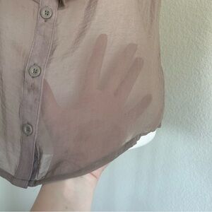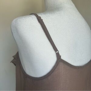 Taupe brown Forever 21 sheer cami. Circa early 2010s. Button up front and ruffle details along neckline. Spaghetti strap tank top with a V neckline. Adjustable straps. Lightweight and airy fabric that drapes beautifully for a flowy silhouette. Sheer fabric, great layering piece. Boho office siren style. Size small. Light brown stains present on / near button placket.