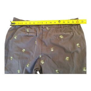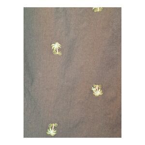 Allover little green embroidered palm trees on a chocolate brown background, zip closure, beltloops, mid rise. Two front pockets and two faux back pockets. Back Elastic waistband. Inseam approx. 17.5". Midweight Twill fabric, 98% cotton 2% spandex. Great condition, no flaws.