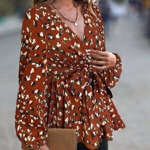 Brown Casual Women's Allover Print Lantern Sleeve Belted Peplum Blouse