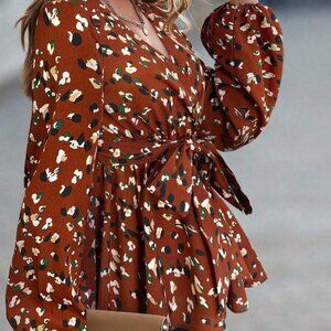 Brown Casual Women's Allover Print Lantern Sleeve Belted Peplum Blouse