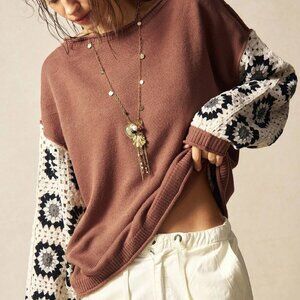 Brown Casual Women's Boho Crochet Patchwork Sweater top