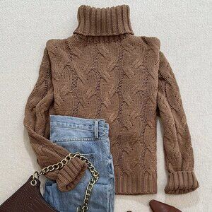 Brown Casual Women's Comfortable Twisted Rope Pattern Textured High neck sweater