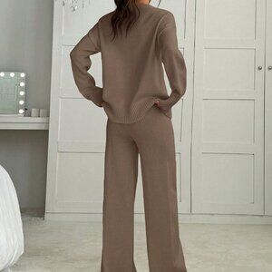 Brown Casual Women's Crew Neck Long Sleeve Sweater And Long Pants Set