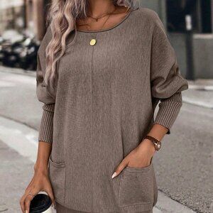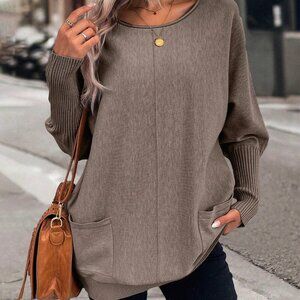 Brown Casual Women's Dual Pocket Batwing Sleeve Pocket Patched Sweater