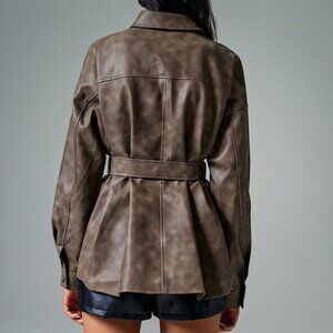 Brown Casual Women's Faux Leather Button Belted Long Sleeve Jacket