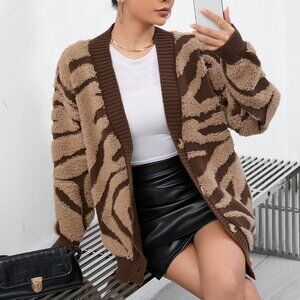 Brown Casual Women's Graphic zebra animal Print Drop Shoulder sweater Cardigan