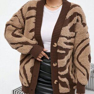 Brown Casual Women's Graphic zebra animal Print Drop Shoulder sweater Cardigan