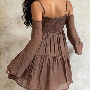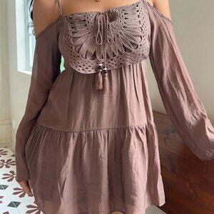 Brown Casual Women's Knitted Colorblock Off-Shoulder Long Sleeve Mini Dress