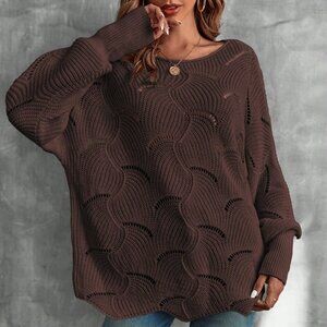 Brown Casual Womens Lantern Sleeve Pointelle Knit Pullover Sweater