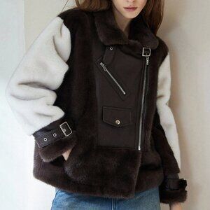 Brown Casual Women's Lapel Zipper Faux Fur colorblock Jacket