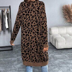 Brown Casual Women's Long Sleeve Leopard Print Long Cardigan Sweater